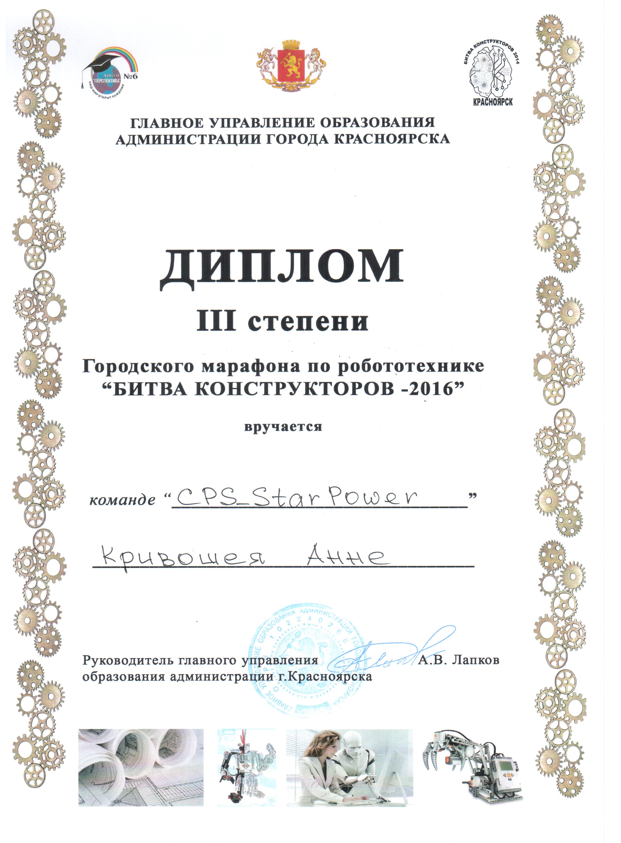 2016_диплом Ани_3 место_робототехника_битва конструкторов