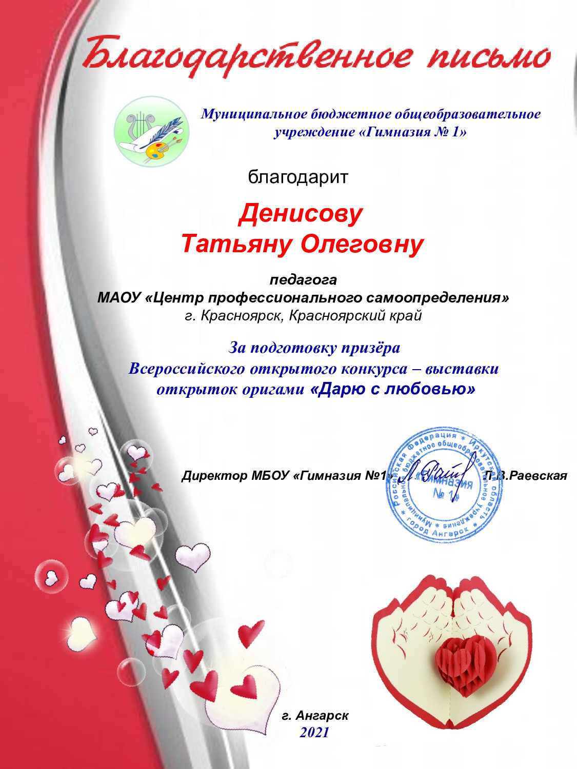 Благодарственное письмо Денисова Татьяна Олеговна
