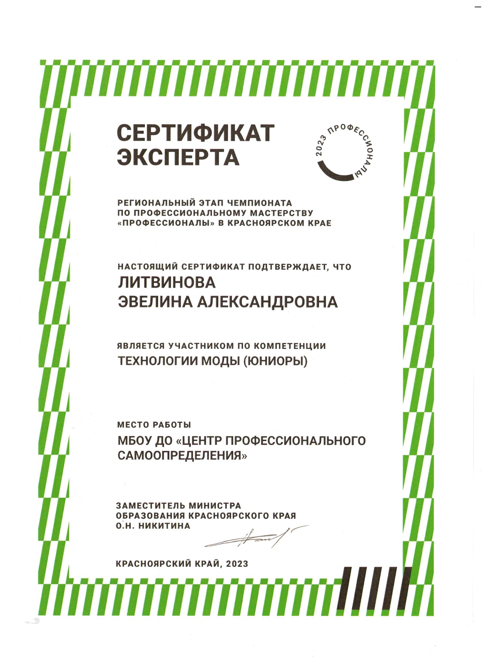 Литвинова Эвелина Александровна Сертификат эксперта